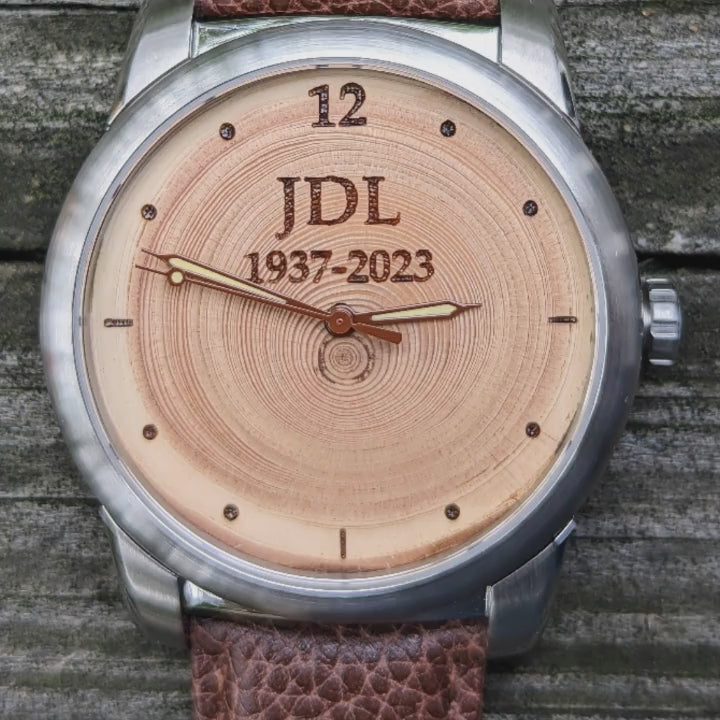 Tree ring watch with leather strap, showcasing natural wood grain matching recipient's special year.